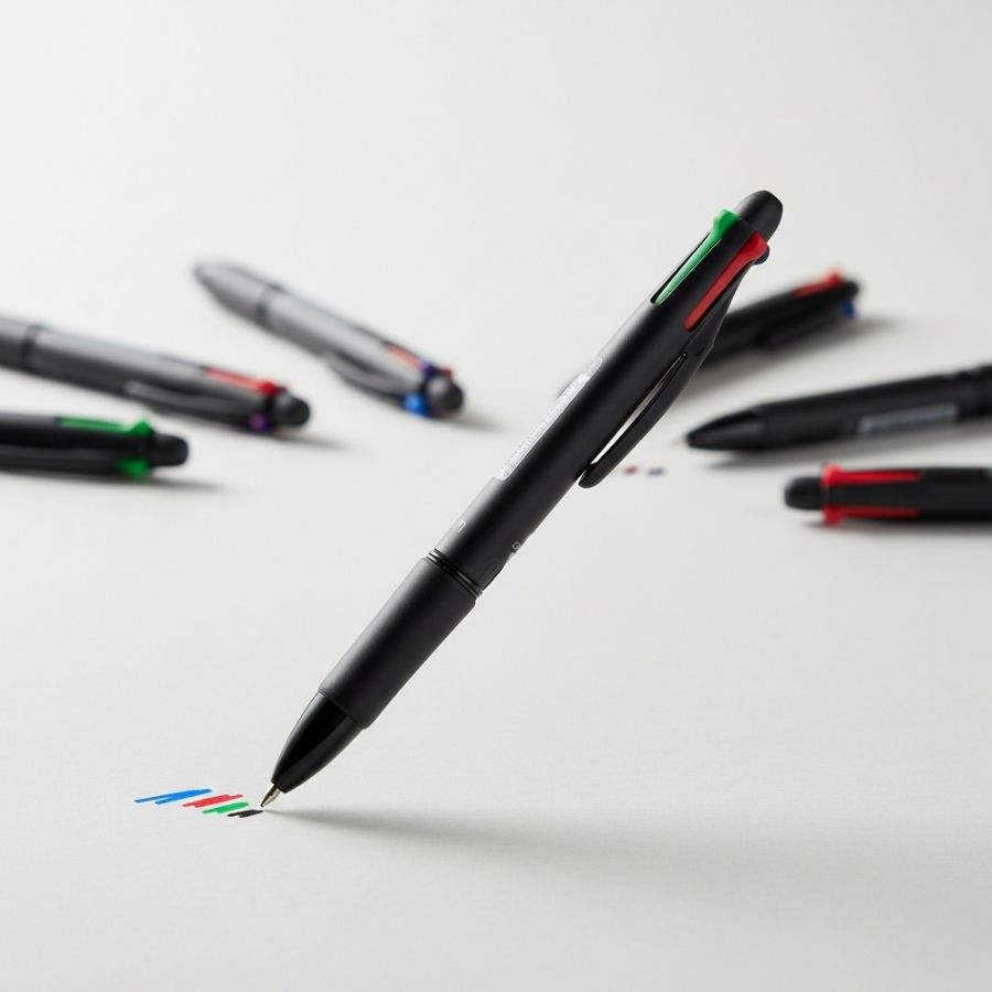 Reúne quatro cores de tinta em um único corpo, permitindo alternar rapidamente entre as cores para organização por categorias e maior eficiência. O grip emborrachado proporciona conforto e firmeza durante a escrita, reduzindo o cansaço em usos prolongados. Seu design funcional facilita o manuseio e garante praticidade no dia a dia.