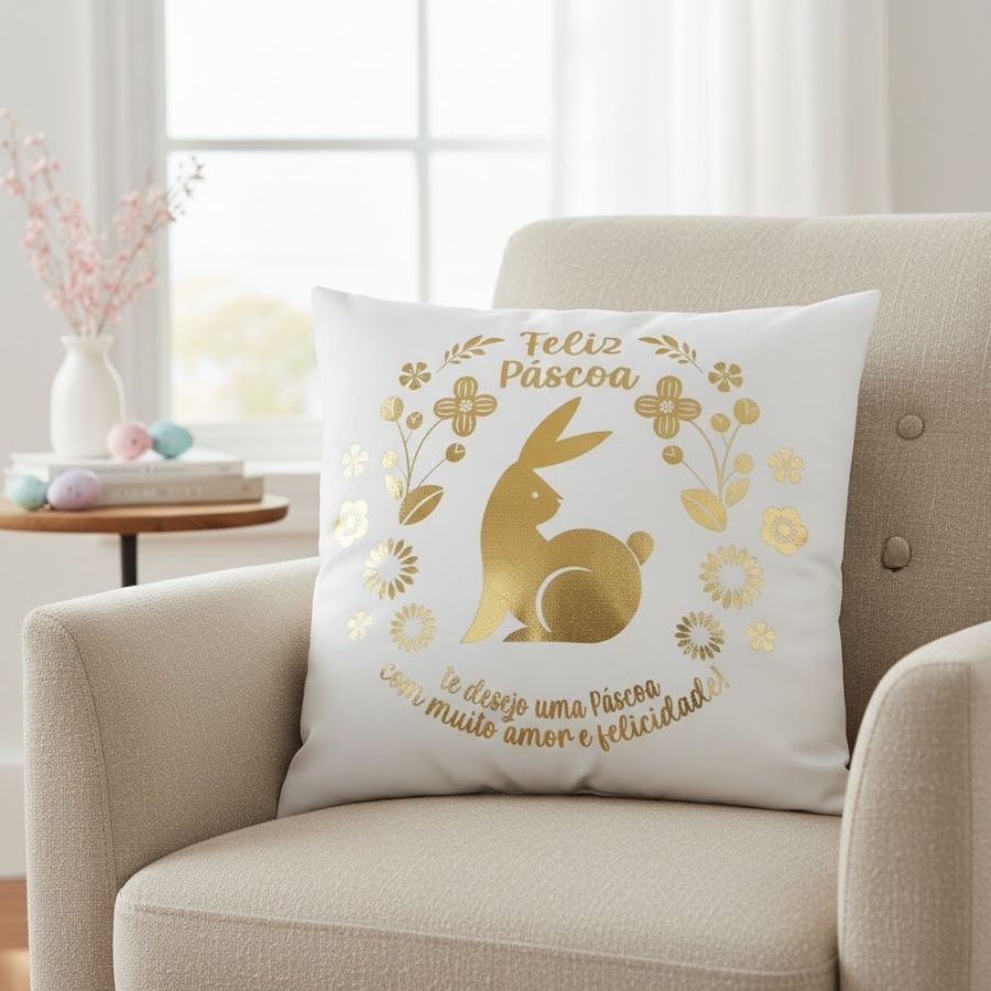 Capa decorativa de Páscoa com estampa “Feliz Páscoa” nas cores branco e dourado, ideal para sofás e ambientes temáticos. Mede aproximadamente 43x43cm e adiciona elegância e clima festivo à decoração.