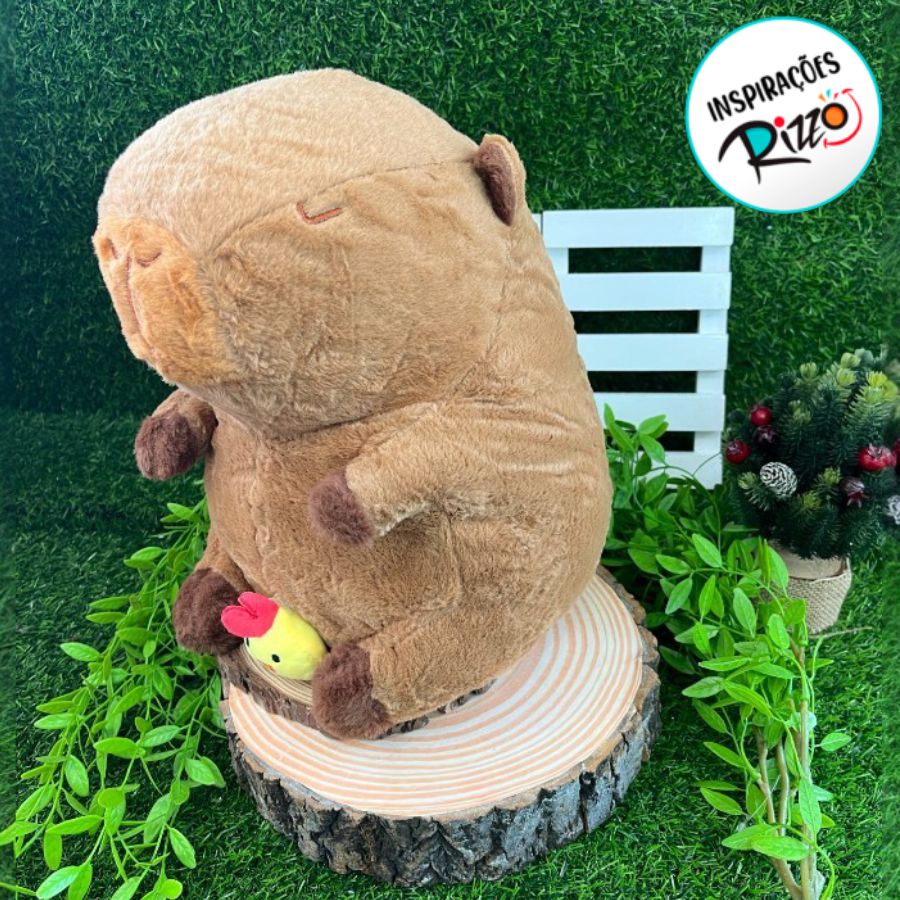 Capivara de pelúcia marrom com pintinho, medindo 29 cm. Uma peça fofa e única, ideal para complementar sua decoração com um toque de charme e originalidade.