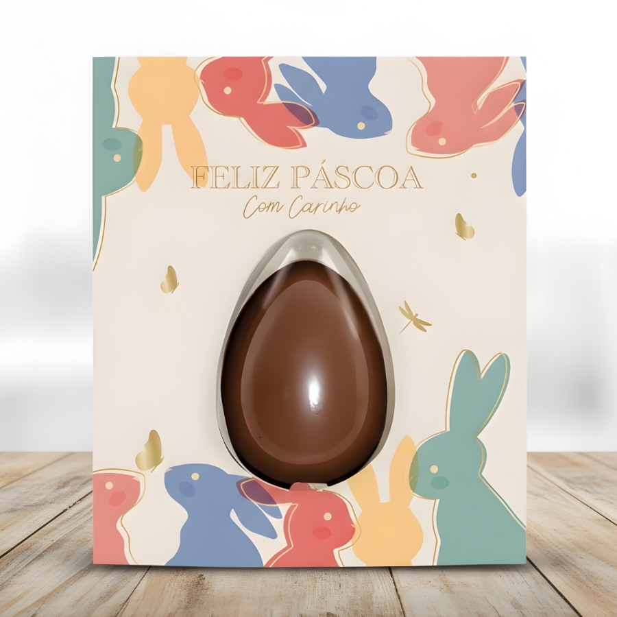 Indicado para confeiteiros, chocolaterias, artesãos e produção artesanal, este cartão com blister atende à necessidade de acomodar um ovo de 50g de forma segura e padronizada. Seu formato contribui para uma apresentação atrativa, ajudando a destacar o chocolate e agregar valor à lembrança pascal.