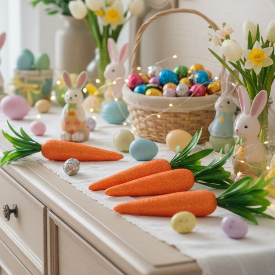 Clássicas da Páscoa e cheias de brilho, as Cenouras Decorativas com Glitter trazem encanto, alegria e um toque lúdico para a decoração pascal. Com acabamento cintilante, elas remetem ao universo do coelhinho da Páscoa e transformam qualquer composição em um cenário festivo, acolhedor e cheio de magia, perfeito para encantar adultos e crianças.