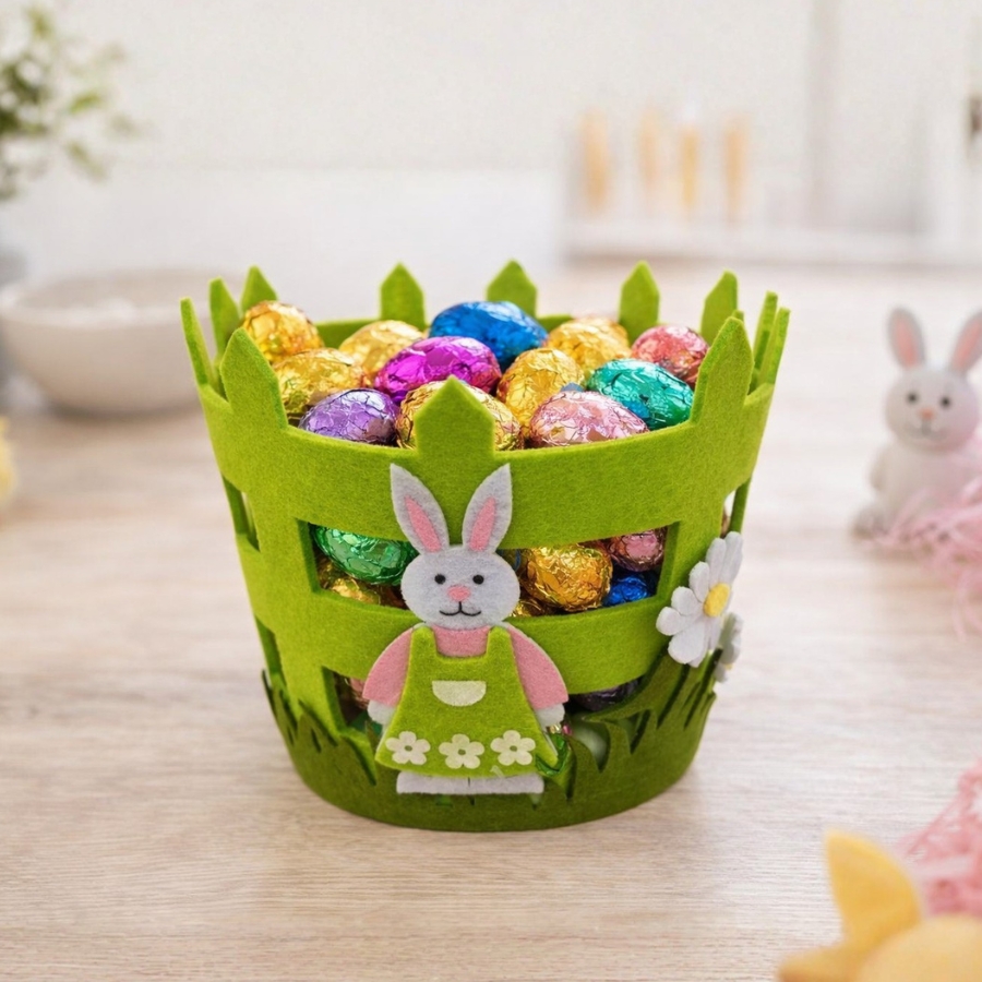 A Cesta Decorativa de Tecido Verde - Coelhinho - 15x17,5cm é um item encantador para compor a decoração de Páscoa e encantar crianças e adultos. Produzida em tecido verde vibrante, possui laterais vazadas e acabamento delicado, trazendo leveza e charme ao visual. Na parte frontal, o destaque fica por conta do simpático coelhinho de tecido, rodeado por graminha e pequenas flores brancas, criando uma cena alegre e típica da temporada pascal.