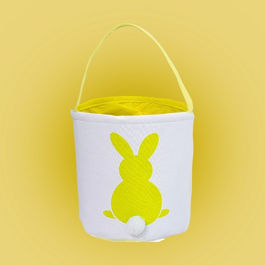 Cesta decorativa de Páscoa com silhueta de coelho na cor amarela, medindo aproximadamente 17x17x18cm, ideal para montar cestas e kits com chocolates, doces e presentes temáticos.