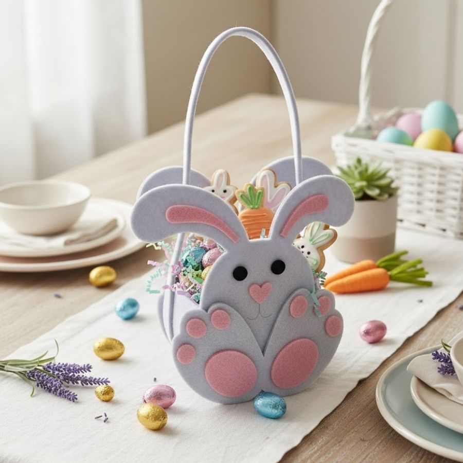 A Cesta de Feltro de Páscoa - Coelho Branco é um item encantador e funcional para compor a decoração e as lembranças da temporada pascal. Feita em feltro macio e resistente, possui formato de coelhinho branco com orelhas e detalhes delicados que trazem um toque lúdico e carinhoso às celebrações.