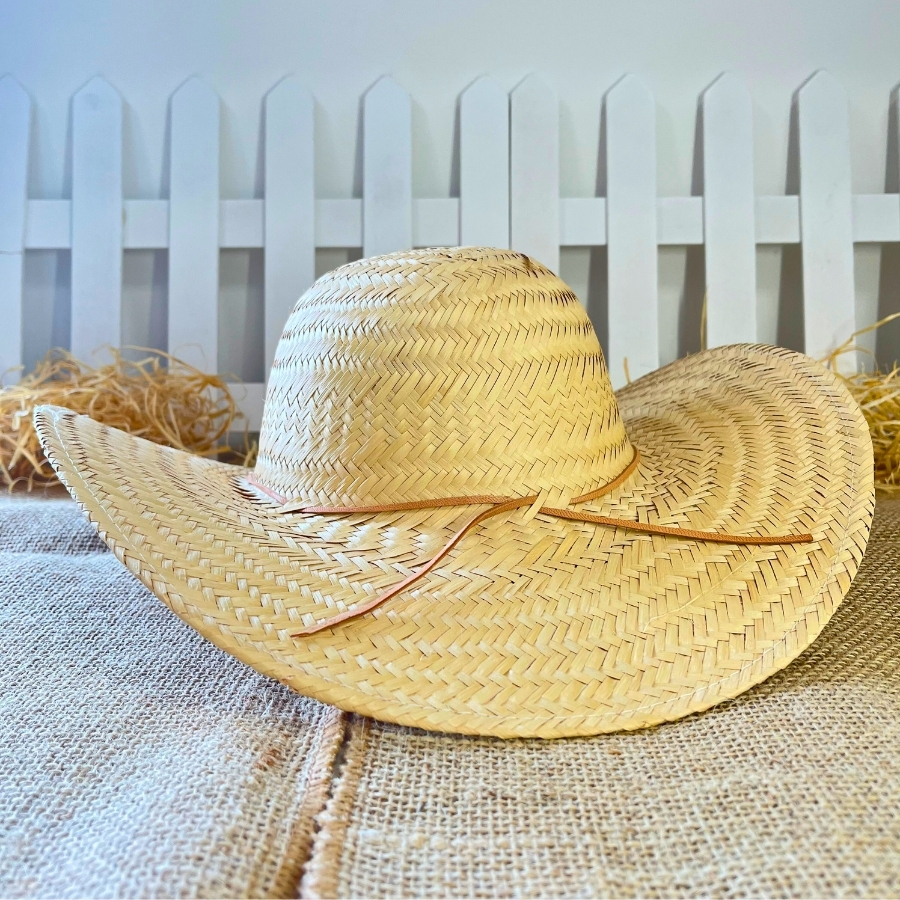 Chapéu confeccionado em palha natural com fita em couro sintético ajustável. Tamanho adulto. Acabamento artesanal com aba larga e copa alta, tradicional do estilo pantaneiro. Indicado para uso em ambientes externos e eventos temáticos.