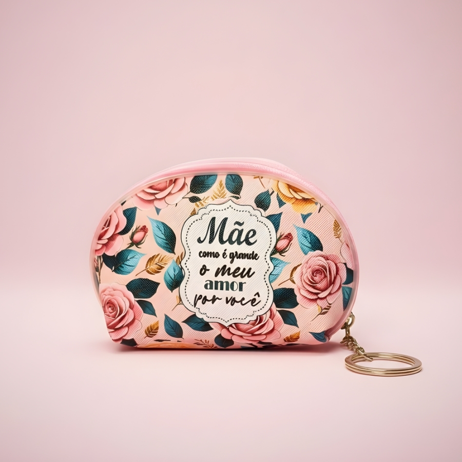 Chaveiro bolsinha porta moedas fabricado em material resistente na cor rosa claro, com dimensões aproximadas de 11cm x 7cm x 3cm. Possui estampa com a frase “Mãe Como é Grande o Meu Amor por Você”. Indicado para armazenamento de moedas, pequenas notas e objetos de pequeno porte. Não é resistente à imersão em água. Para limpeza, utilizar pano macio levemente umedecido e evitar produtos abrasivos para preservar a estampa e o material.