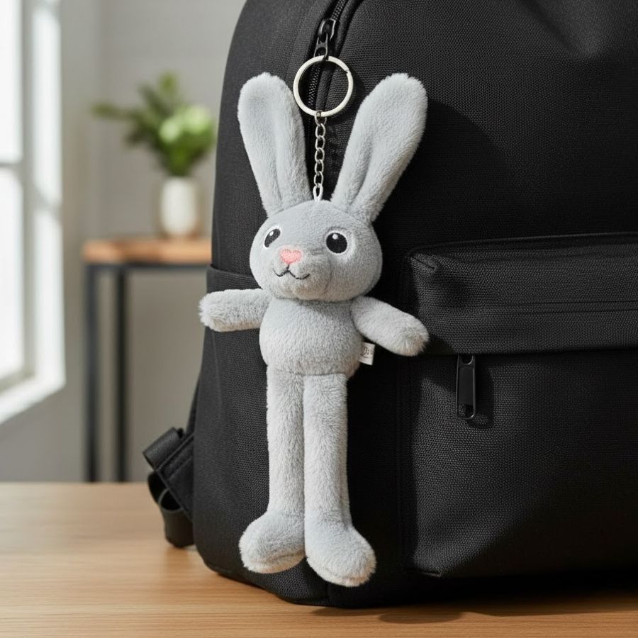 Chaveiro em formato de coelho de pelúcia cinza, ideal para presentear ou usar como lembrancinha de Páscoa. Mede aproximadamente 27x12x4cm e combina fofura, estilo e funcionalidade.
