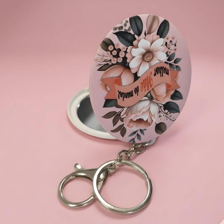 Na cor salmão, traz um toque suave e moderno, perfeito para acompanhar a rotina com estilo. Compacto e leve, pode ser preso às chaves, bolsas ou mochilas, garantindo um espelho sempre à mão quando necessário. Um mimo útil e simbólico para presentear em datas especiais ou surpreender com um gesto cheio de amor.