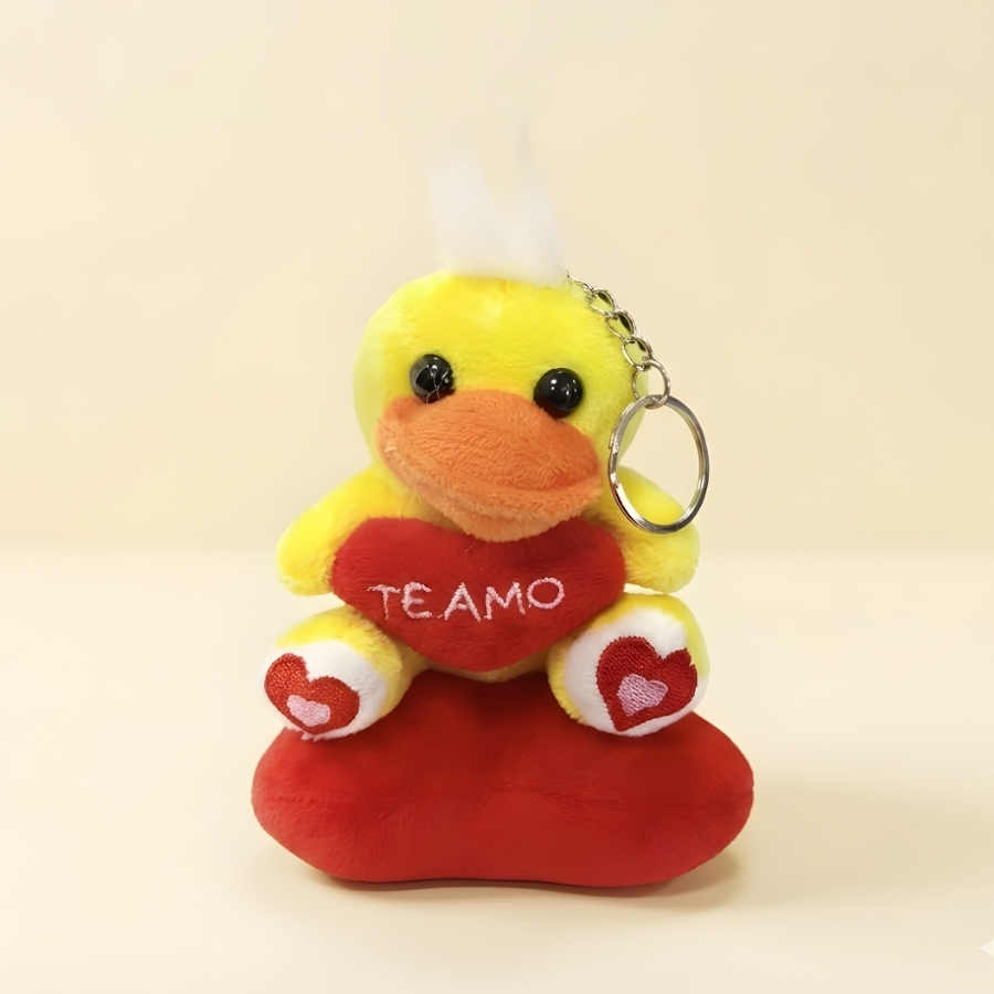 Chaveiro de pelúcia com temática “Te Amo”, no formato de pato com coração. Dimensões aproximadas de 10x12x6cm. Indicado para uso como acessório em chaves, bolsas e similares. Recomenda-se evitar contato com umidade excessiva e realizar limpeza adequada para produtos em pelúcia. As medidas informadas correspondem ao tamanho aproximado do produto.