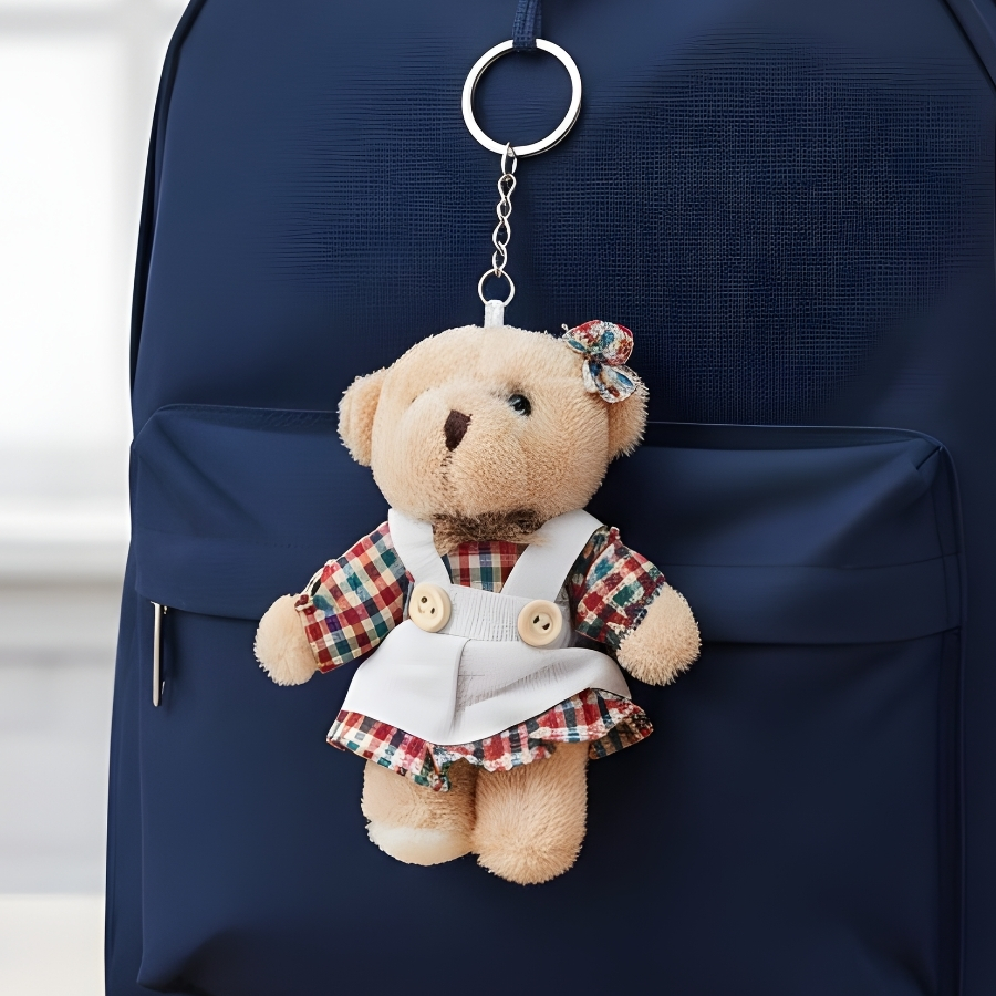 Chaveiro ursa de pelúcia com macacão e saia xadrez colorido, com dimensões aproximadas de 8x11x4cm. Desenvolvido como acessório decorativo para uso em chaves, bolsas e mochilas.