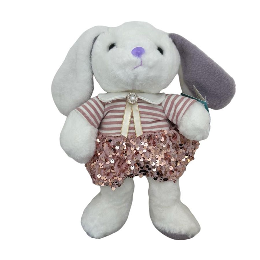 Coelha de pelúcia com focinho e orelhas roxas, vestindo camisa listrada, branca e rose, e saia com glitters rose