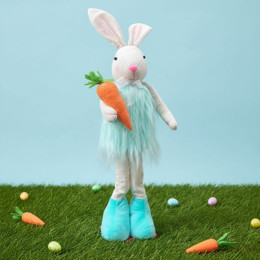Coelho Decorativo em Pé, com vestido felpudo e sapatos azul claro, junto com uma cenoura na mão