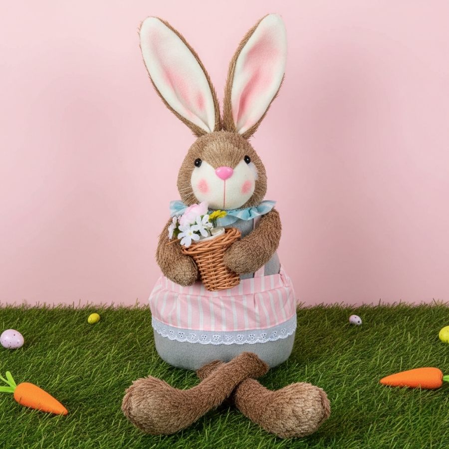 Esta decoração é perfeita para criar uma atmosfera acolhedora e primaveril em sua casa ou espaço. A imagem de uma coelha segurando um vaso de flores evoca uma sensação de serenidade e frescor, tornando-a uma adição encantadora à decoração de Páscoa, eventos primaveris ou simplesmente para quem aprecia elementos fofos e florais em sua decoração.