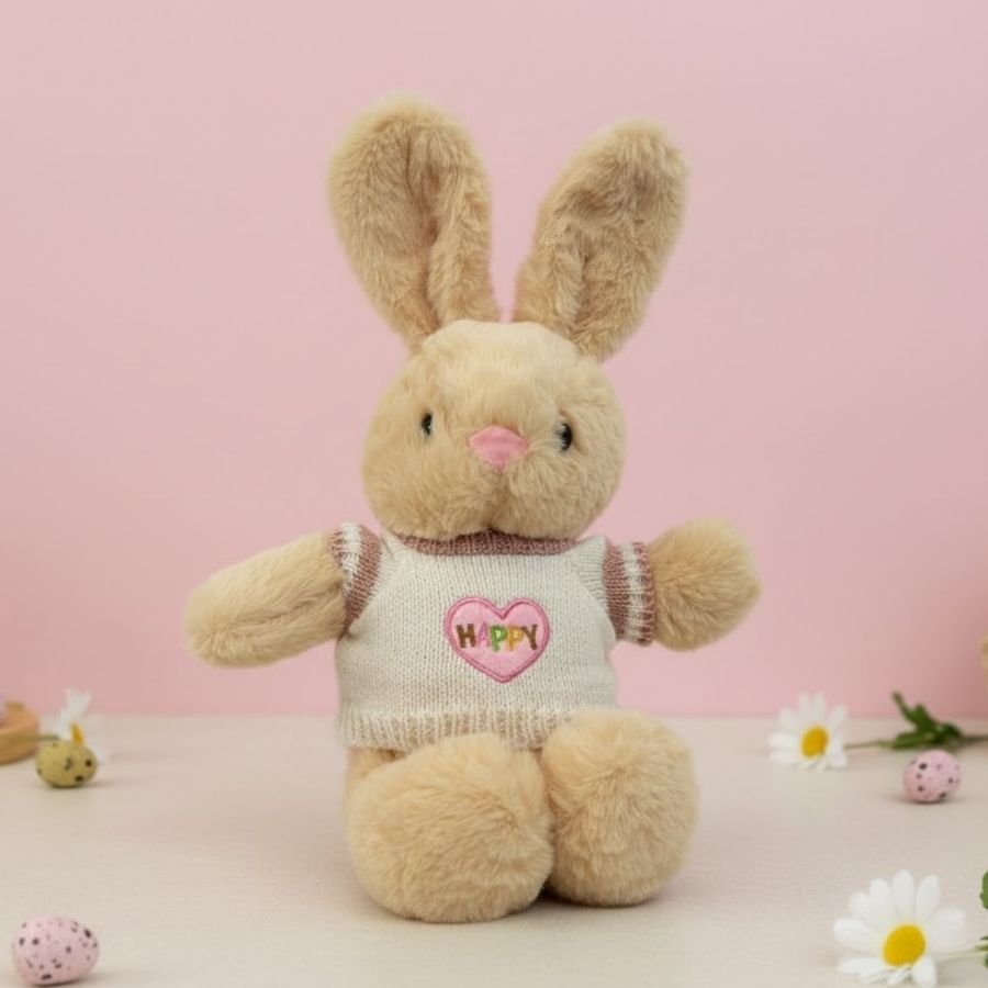 Coelho de pelúcia bege, vestindo blusa “Happy” em branco e rosa. Ideal para decoração e presentes de Páscoa, com medidas aproximadas de 38,5x24x14cm.