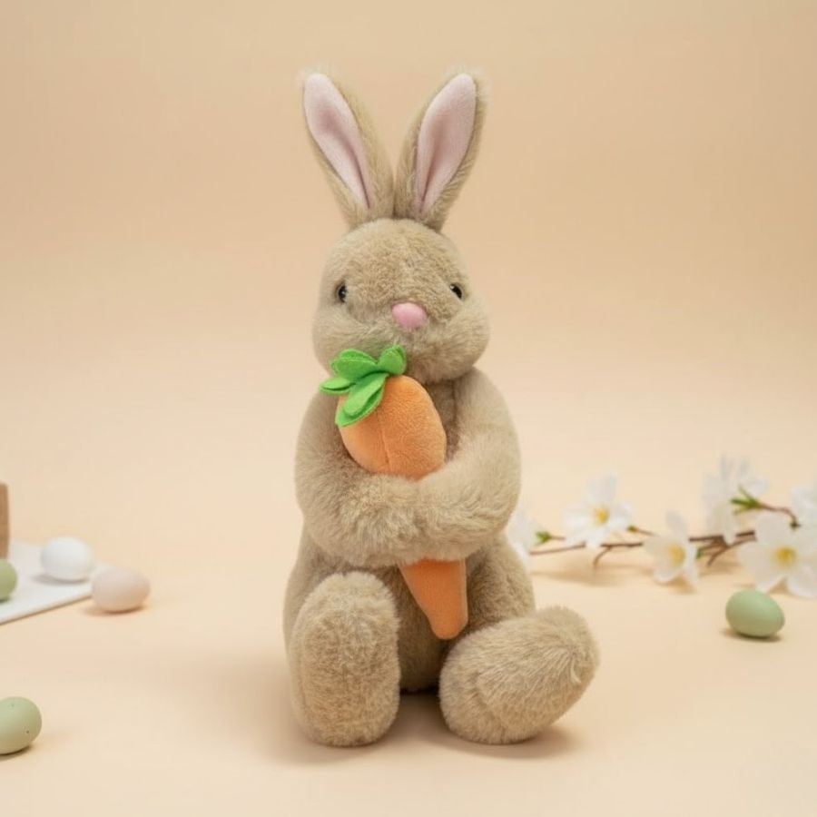 Aconchegante, lúdico e cheio de charme, o Coelho de Pelúcia Bege Sentado Segurando Cenoura traz toda a ternura da Páscoa para a decoração. A cenourinha nas mãos destaca o clima infantil e divertido, criando uma atmosfera acolhedora e encantadora que transforma qualquer ambiente em um cenário pascal delicado e alegre.