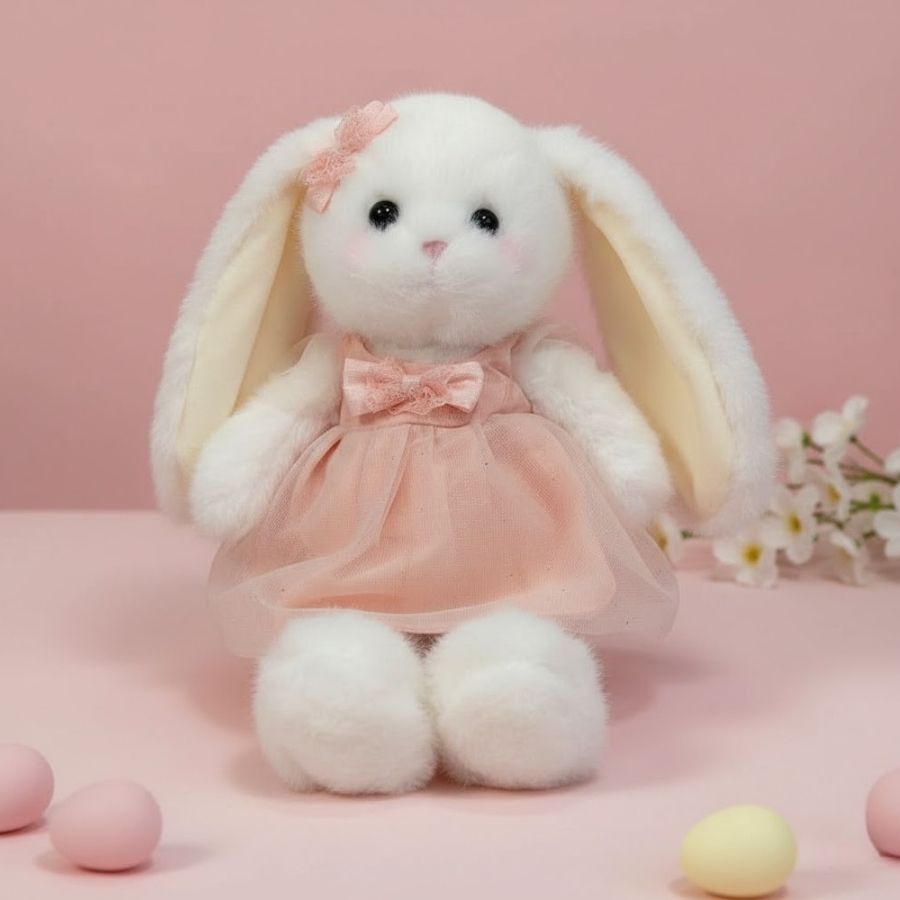 Delicado, romântico e absolutamente encantador, o Coelho de Pelúcia Branco de Vestido Rosa traduz toda a doçura da Páscoa em um visual leve e acolhedor. O contraste do branco com o rosa suave cria uma atmosfera afetiva, perfeita para cenários que celebram carinho, renovação e momentos especiais em família.