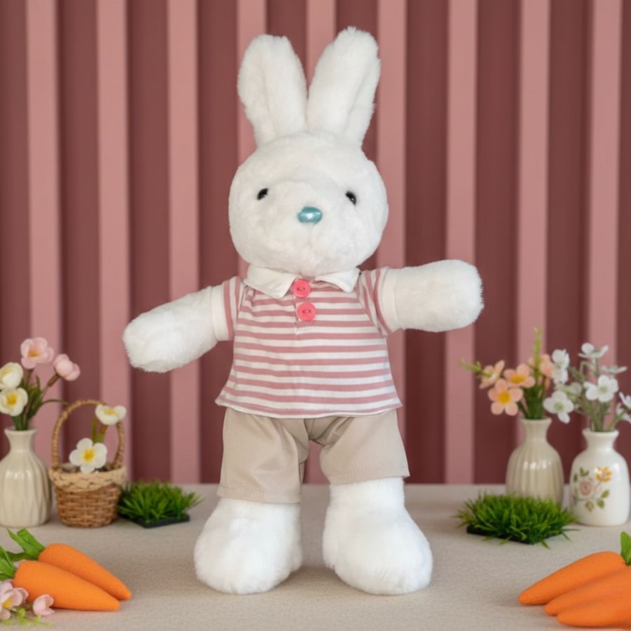 O Coelho de Pelúcia Camisa Listrada é uma peça encantadora que combina delicadeza, aconchego e charme em um único produto. Com acabamento cuidadoso e toque extremamente macio, ele possui pelúcia branca e veste uma elegante camisa listrada em tons de branco e rosa, harmonizada com uma calça bege, criando um visual clássico e acolhedor.