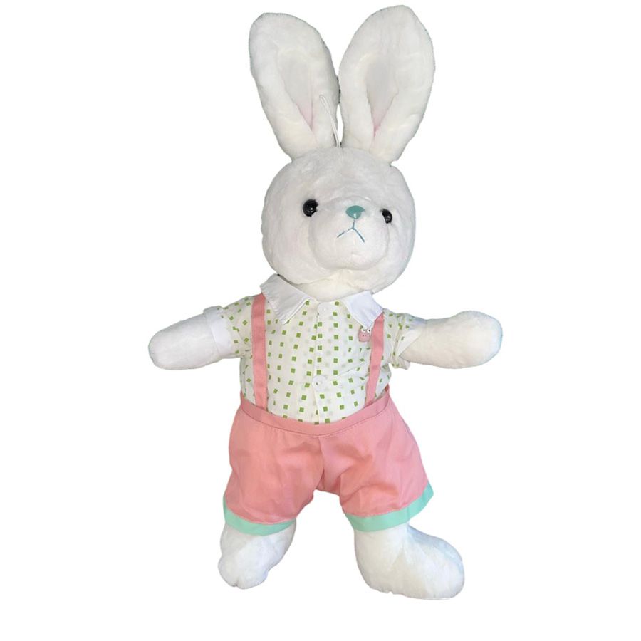 Coelho de pelúcia com jardineira rosa, e uma camisa com vários quadrados verdes estampados