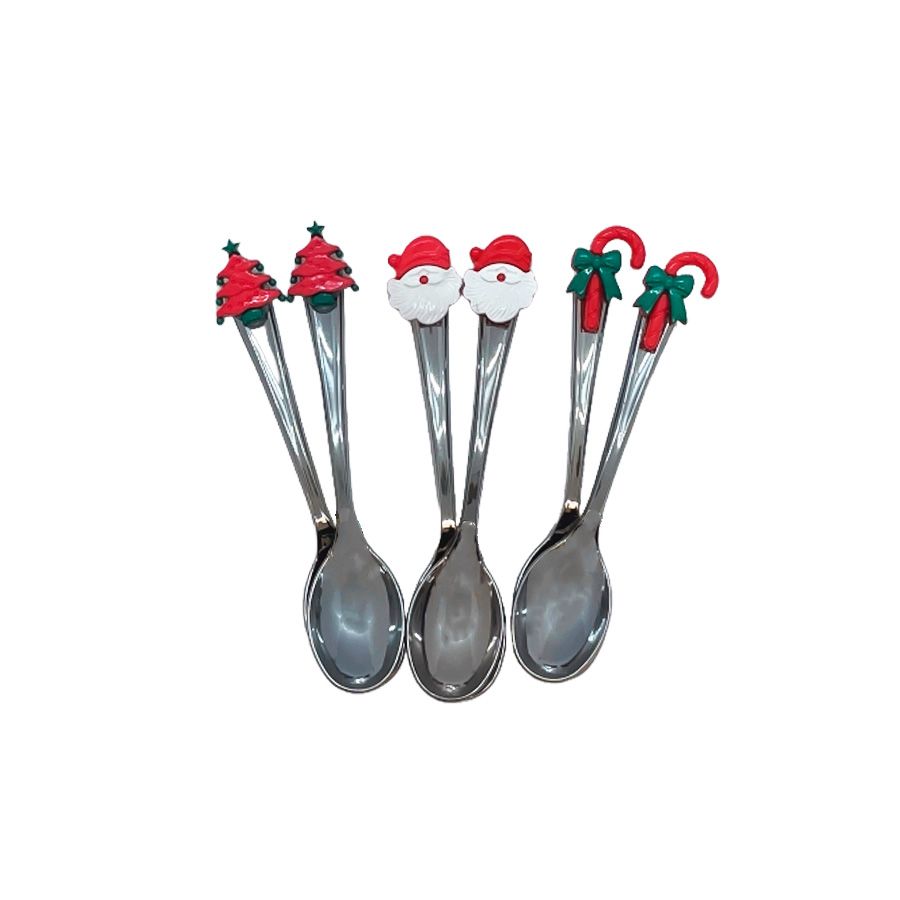 6 Colherzinhas de Natal de sobremesa na cor chumbo, com decoração de aplique, sendo 2 de árvore de natal, 2 de Papai Noel e 2 de Cajado