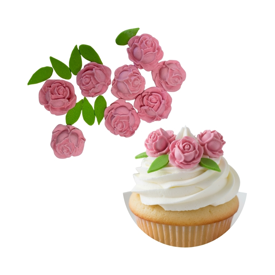 Confeito de açúcar rosas Lolita rosa pastel com folhas, ideal para decorar doces com delicadeza, elegância e acabamento sofisticado.