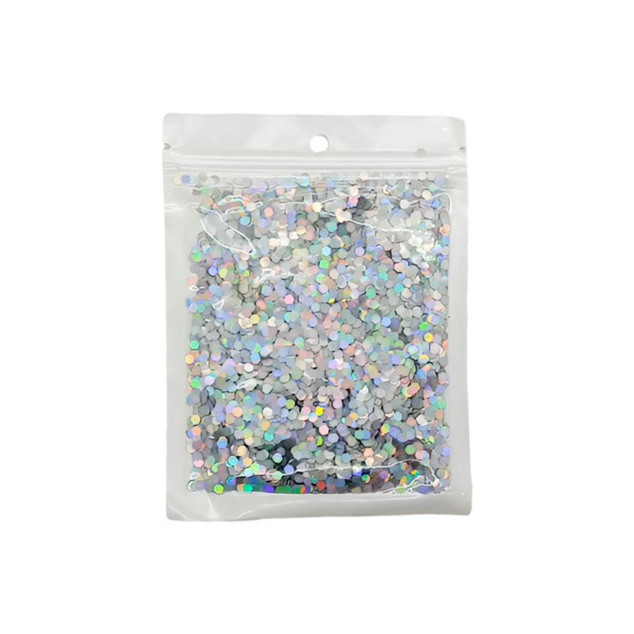 Confete decorativo hexagonal holográfico na cor prata.