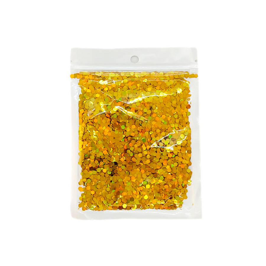 Confete decorativo hexagonal holográfico na cor ouro.