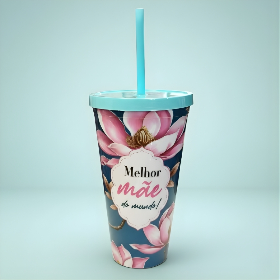 Copo plástico na cor azul, com capacidade de 600ml. Acompanha tampa e canudo. Possui estampa com a frase “Melhor Mãe do Mundo”. Indicado para bebidas frias. Recomenda-se lavar antes do primeiro uso. Não utilizar em micro-ondas ou com líquidos excessivamente quentes, salvo orientação diferente do fabricante na embalagem. Para preservar a estampa, evitar o uso de esponjas abrasivas e produtos químicos agressivos. Consultar o rótulo para informações adicionais sobre material, resistência térmica e conservação.