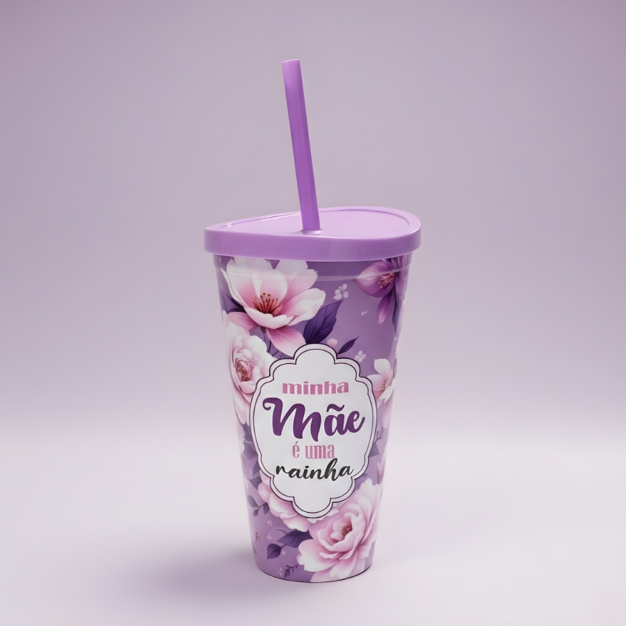 Copo plástico na cor roxa, com capacidade de 600ml. Acompanha tampa e canudo. Possui estampa com a frase “Minha Mãe é Uma Rainha”. Indicado para bebidas frias. Recomenda-se lavar antes do primeiro uso. Não utilizar em micro-ondas ou com líquidos excessivamente quentes, salvo orientação diferente do fabricante na embalagem. Evitar o uso de esponjas abrasivas para preservar a estampa. Consultar o rótulo para informações adicionais sobre material, resistência térmica e conservação.
