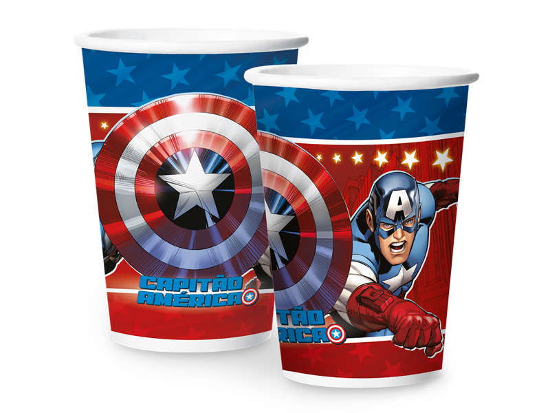 Copo de papel com estampa do Capitão América, perfeito para servir bebidas na sua festa de aniversário ou evento temático.