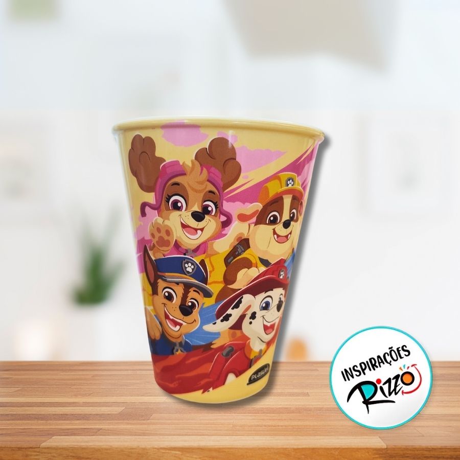 Copo plástico de 280ml, na cor amarelo, com estampa da Patrulha Canina. Ideal para crianças e para tornar as refeições mais divertidas.