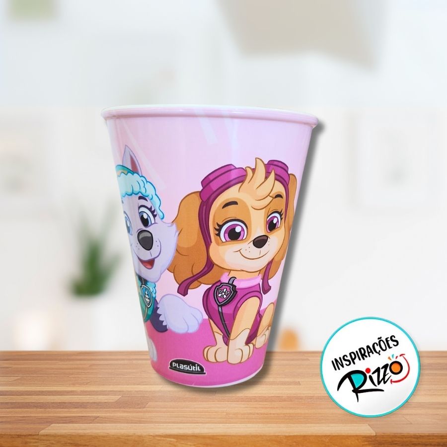 Copo plástico de 280ml, na cor rosa, com estampa da Patrulha Canina. Ideal para crianças e para tornar as refeições mais divertidas.