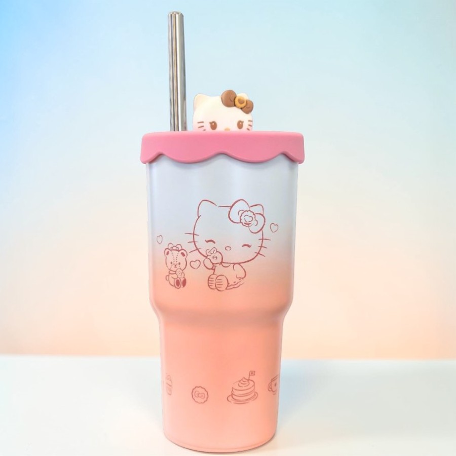 Copo térmico com canudo e tampa, inspirado em Hello Kitty. Produto licenciado.