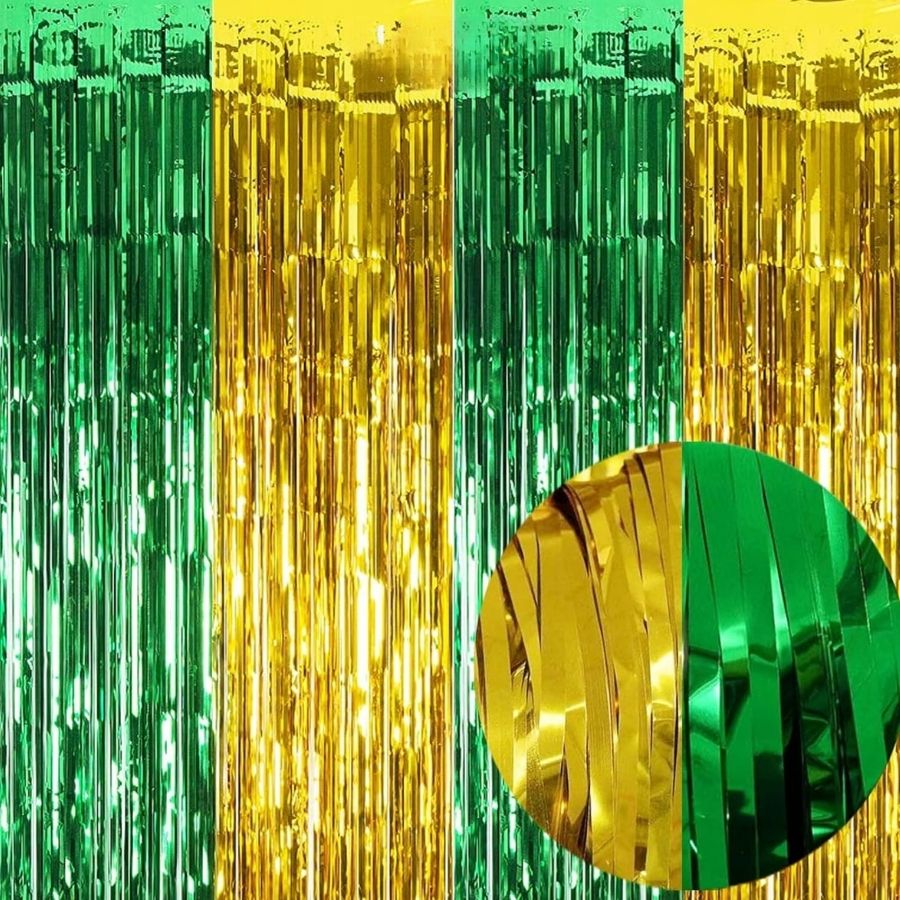 Cortina larga metalizada dourada e verde com brilho intenso, ideal para painéis, entradas e decorações festivas. Fácil de instalar, cria impacto visual e adiciona cor e movimento ao ambiente.