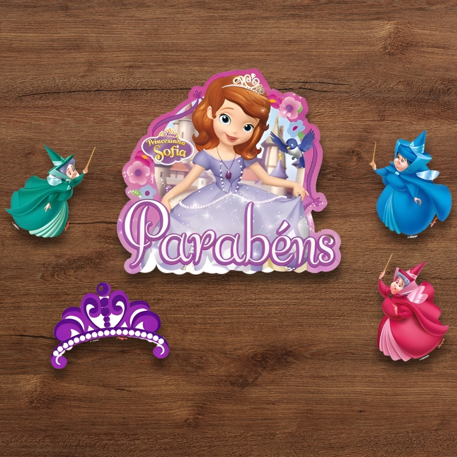 A Decoração de Bolo Sofia The First mede 13x22,5cm e é confeccionada em material durável, sendo indicada para compor bolos decorativos em festas infantis com tema da Princesa Sofia.