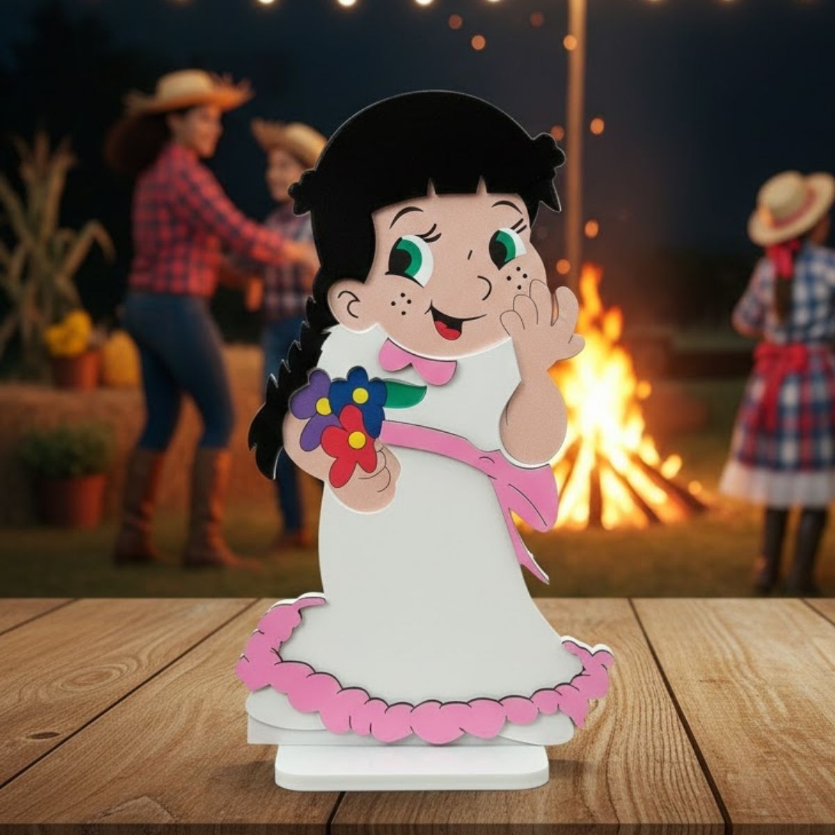 A silhueta de uma noiva caipira em MDF, com rosto sorridente, bochechas rosadas, vestido branco com detalhes rosa e segurando um buquê de flores coloridas, representa a alegria e a tradição da festa mais querida do Brasil. O design em pé facilita a sua colocação em qualquer lugar da sua casa.