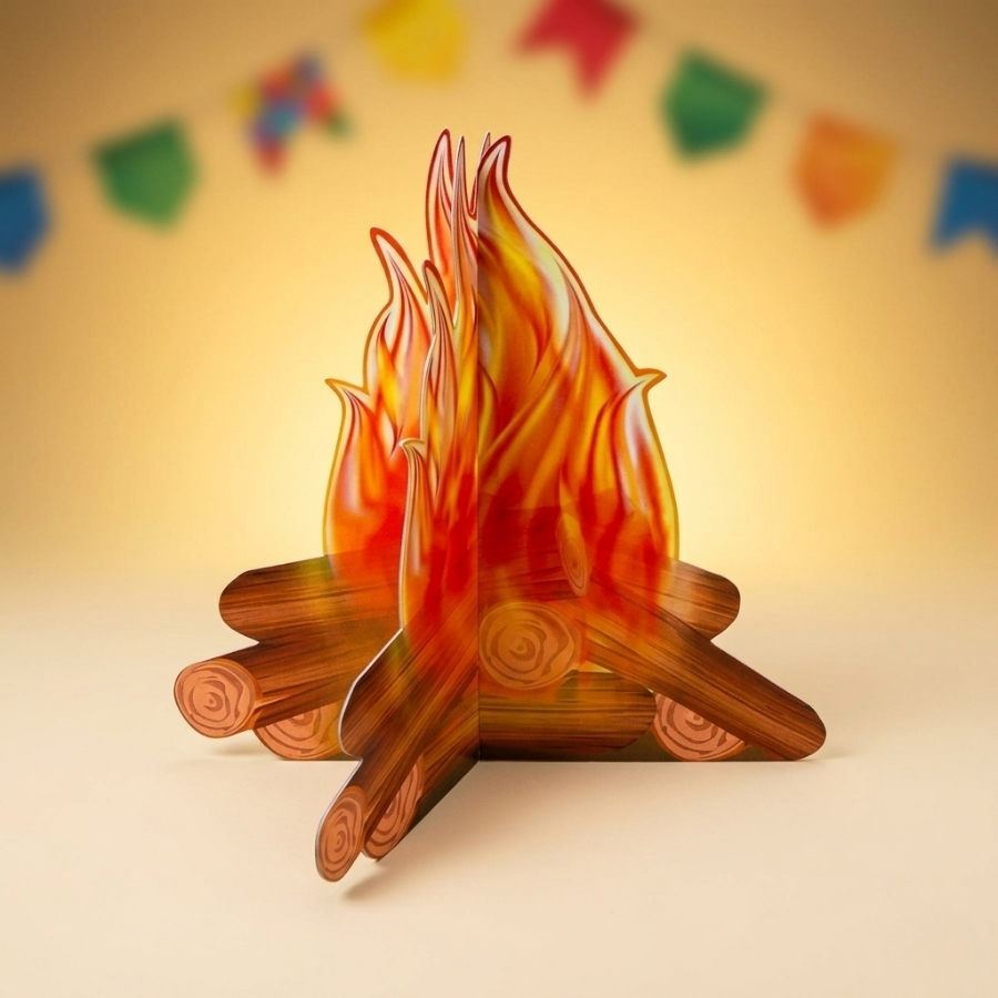Enfeite decorativo 3D em formato de fogueira, ideal para compor mesas temáticas e cenários de festa junina com destaque e praticidade.