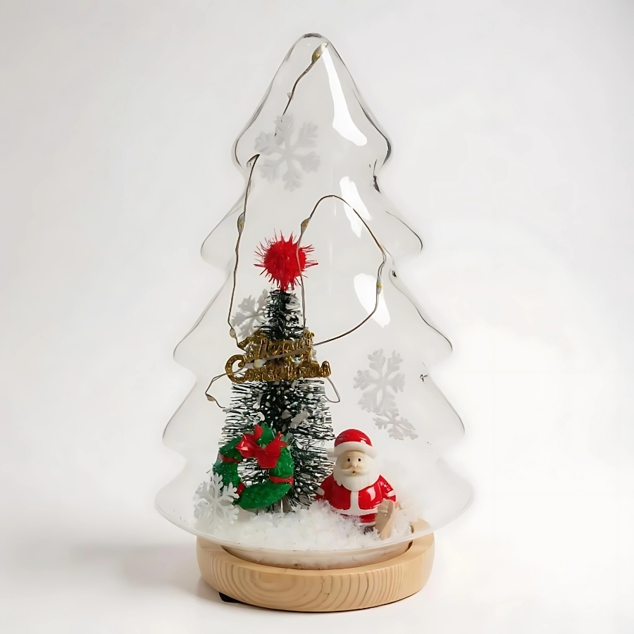 Com dimensões de 10x18,5x8cm, o enfeite é feito em vidro, trazendo uma árvore de Natal com iluminação LED e a figura do Papai Noel em cenário nevado. É uma peça decorativa ideal para uso interno, funcionando como ponto de luz e destaque em ambientes festivos. Funciona com pilhas (não inclusas), oferecendo praticidade na montagem da decoração.