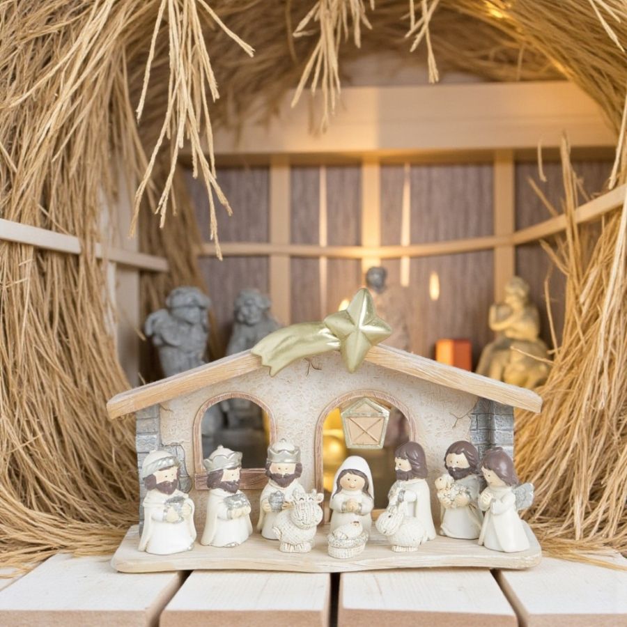 O Enfeite de Natal em Resina Presépio Marrom/Branco/Ouro 19x10,5cm é delicado, simbólico e versátil, perfeito para mesas, arranjos e decorações natalinas que valorizam a tradição do Natal.