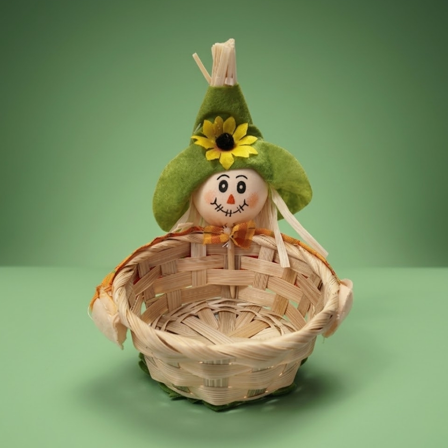 Cestinha decorativa com tema de espantalho, na cor verde. Possui dimensões aproximadas de 12cm de largura, 5cm de altura e 12cm de profundidade. Indicada para uso decorativo e acondicionamento de itens leves. Recomenda-se evitar contato com umidade ou líquidos para preservar a integridade do produto. Não indicada para contato direto com alimentos sem proteção interna.