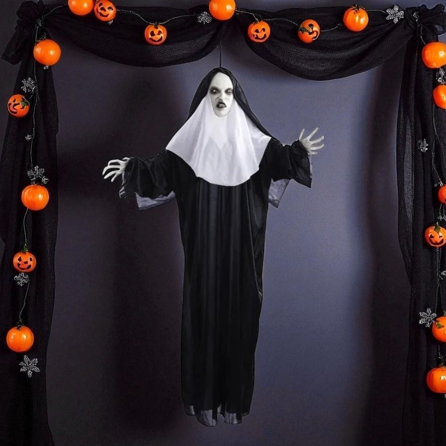 Enfeite decorativo de Halloween com luz e som, modelo Freira Gaetana, 100cm, ideal para ambientações temáticas. Pilhas AAA não inclusas.