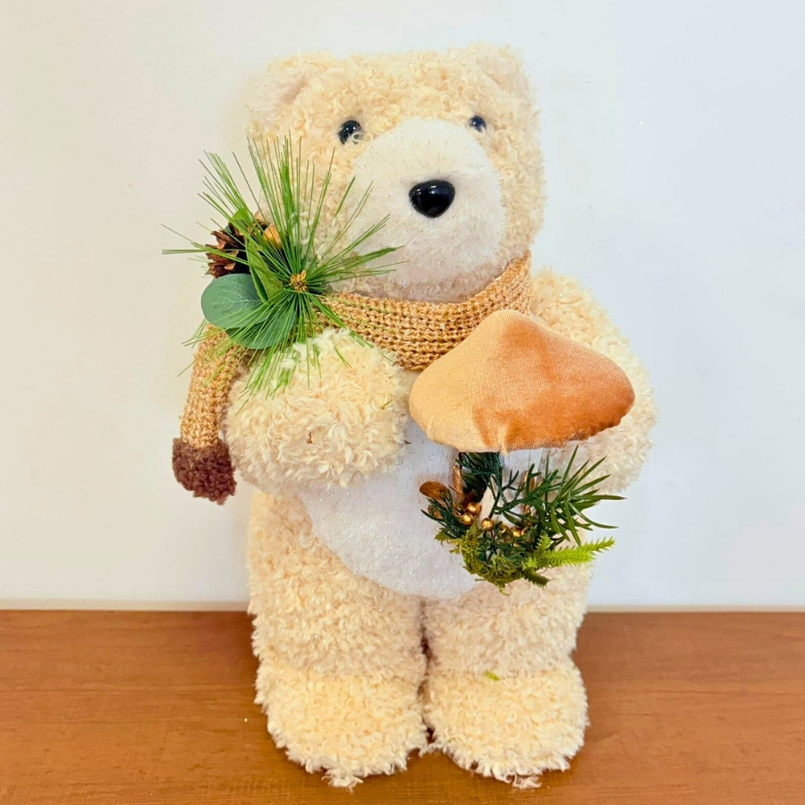 Urso decorativo bege confeccionado em tecido e materiais resistentes, com acabamento em cachecol e cogumelo. Mede 39x20x19cm e é indicado para decorações natalinas e temáticas em ambientes internos.