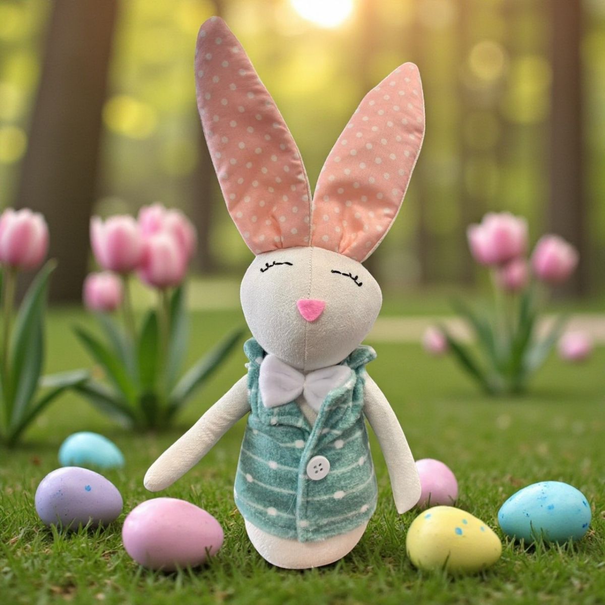 A Enfeite Decorativo de Páscoa – Coelha com Roupa Verde e Bolinhas – 27cm é um charme à parte para deixar sua decoração ainda mais fofa e funcional. Feita especialmente como peso de porta, ela combina praticidade com um visual encantador. A coelhinha usa uma roupinha verde turquesa com bolinhas brancas, trazendo um ar alegre e delicado ao ambiente. No pescoço, um laço branco completa o visual, reforçando a estética suave e pascoalina do item.