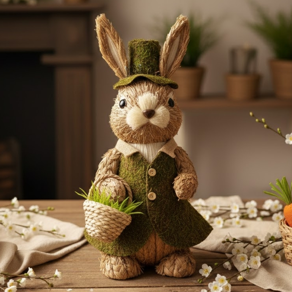 O Enfeite Decorativo de Páscoa Coelha de Palha com Cesto de Ovos é uma peça encantadora e cheia de delicadeza, perfeita para compor decorações pascais com um toque rústico e natural. A coelha é confeccionada em palha e veste roupa e chapéu feitos de musgo, criando um visual campestre e acolhedor.