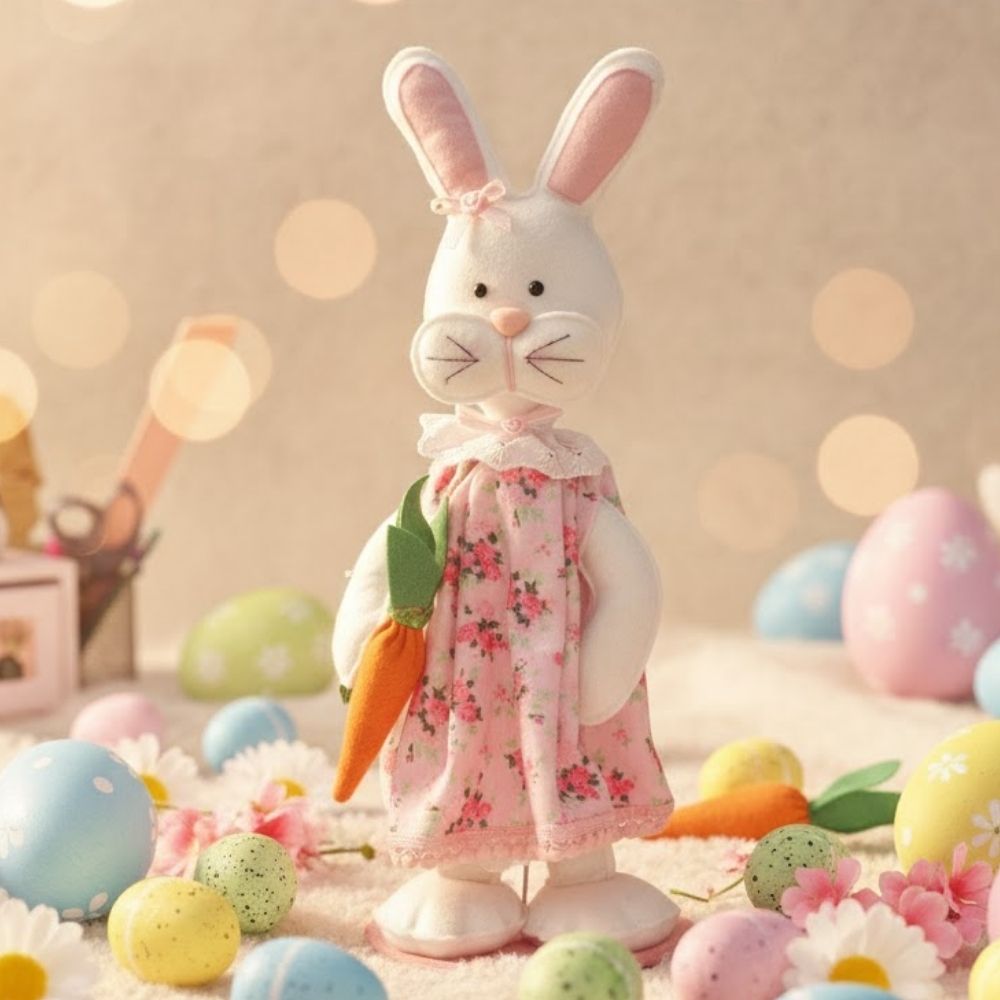 Encantador e cheio de personalidade, o enfeite decorativo de Páscoa Coelha de Vestido Florido é ideal para criar uma atmosfera acolhedora e temática. A peça representa uma coelha em pé, apoiada em uma base firme, vestindo um vestido florido fofo que transmite delicadeza e charme artesanal. Para completar a cena, a coelha segura uma cenoura, reforçando o clima clássico e lúdico da Páscoa.