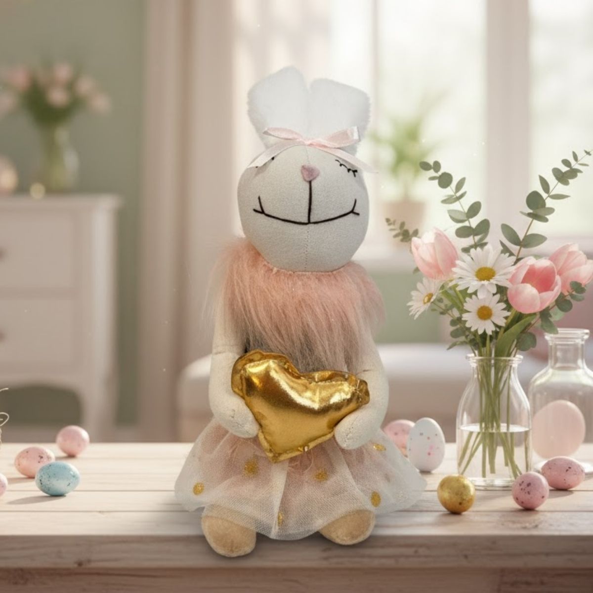 O Enfeite Decorativo de Páscoa - Coelho de Saia com Coração Dourado - 29cm é pura doçura e charme para a sua decoração pascal. A coelhinha exibe uma expressão delicada e acolhedora, vestida com uma saia rosa fofa e segurando um coração dourado nas mãos — símbolo de carinho e amor. Seu visual combina perfeitamente com decorações que misturam o lúdico e o elegante, tornando-se uma peça destaque em qualquer ambiente.