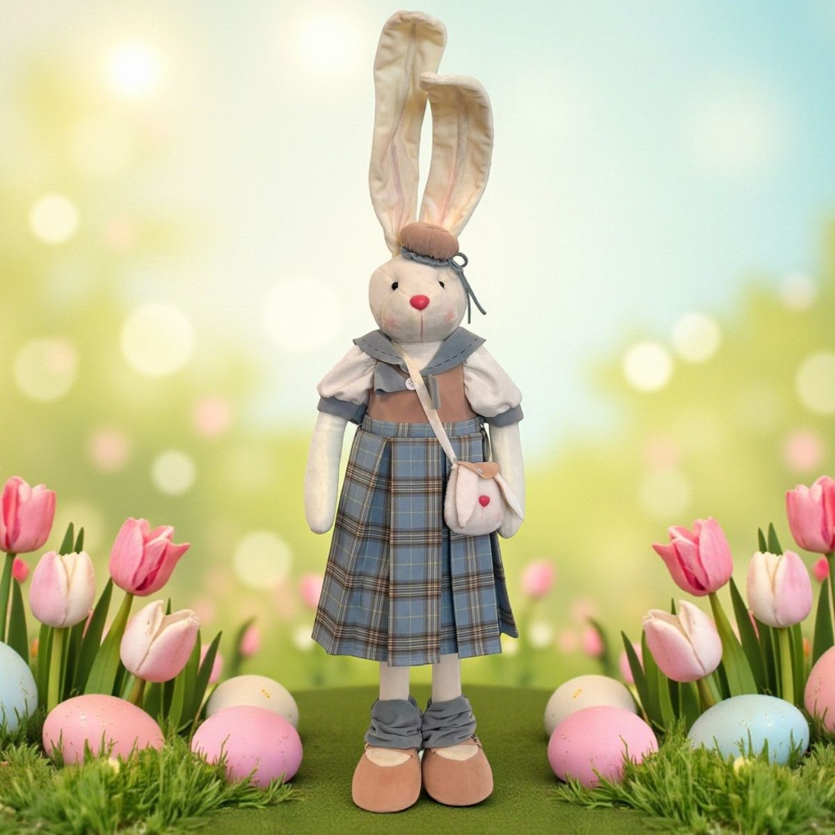 O Enfeite Decorativo de Páscoa - Coelho de Vestido Xadrez e Bolsa - 80cm é uma peça encantadora e cheia de personalidade, ideal para quem deseja uma decoração de Páscoa marcante e sofisticada. O coelho, de pelagem branca e fofa, veste um elegante vestido em tecido xadrez nas cores suaves, com detalhes delicados e acabamento impecável. Carrega uma charmosa bolsinha no formato de cabecinha de coelho, que adiciona um toque lúdico e temático à peça.
