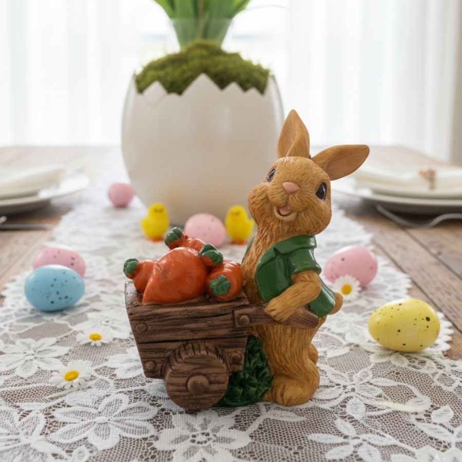 Enfeite decorativo de Páscoa em resina com coelhinho e carriola de cenourinhas, ideal para mesas, vitrines e cenários temáticos. Mede aproximadamente 9x6x4cm e adiciona charme e clima lúdico à decoração pascal.