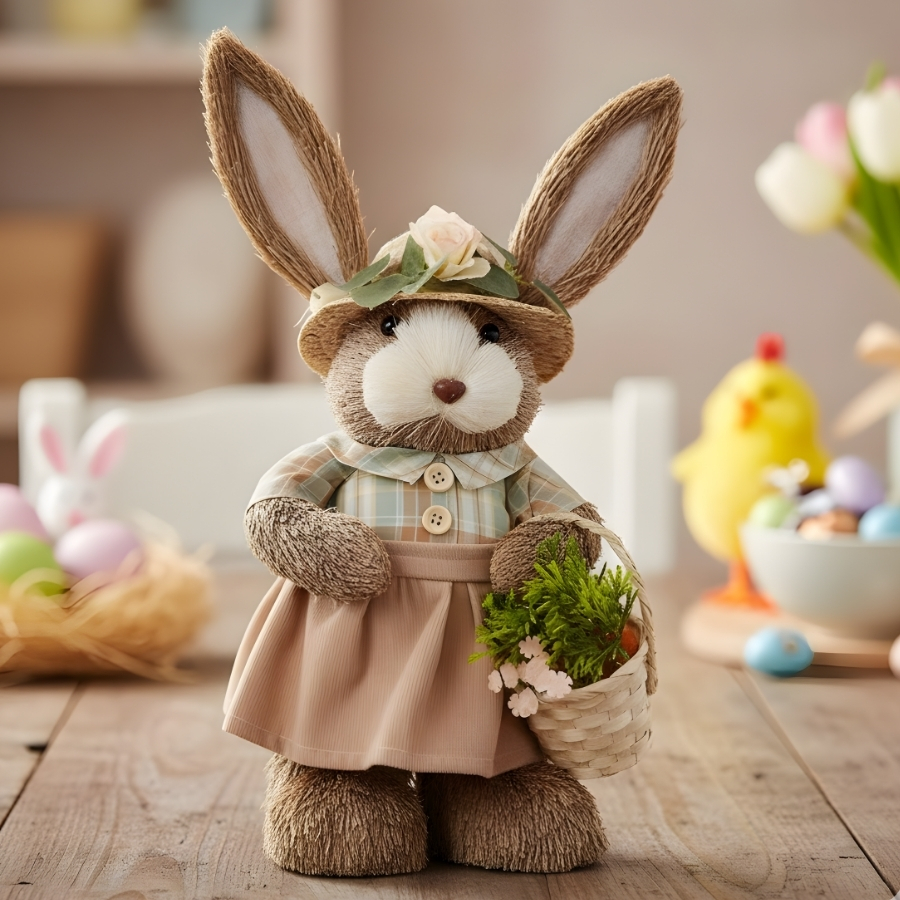 Perfeito para quem deseja criar uma ambientação temática completa e atrativa, o boneco decorativo de coelho ajuda a resolver a necessidade de preencher espaços com uma peça de destaque. Ele contribui para tornar o ambiente mais acolhedor e temático, sendo uma excelente escolha para lojas, eventos, festas, escolas e decorações residenciais que desejam transmitir a identidade da Páscoa de forma clara e decorativa.