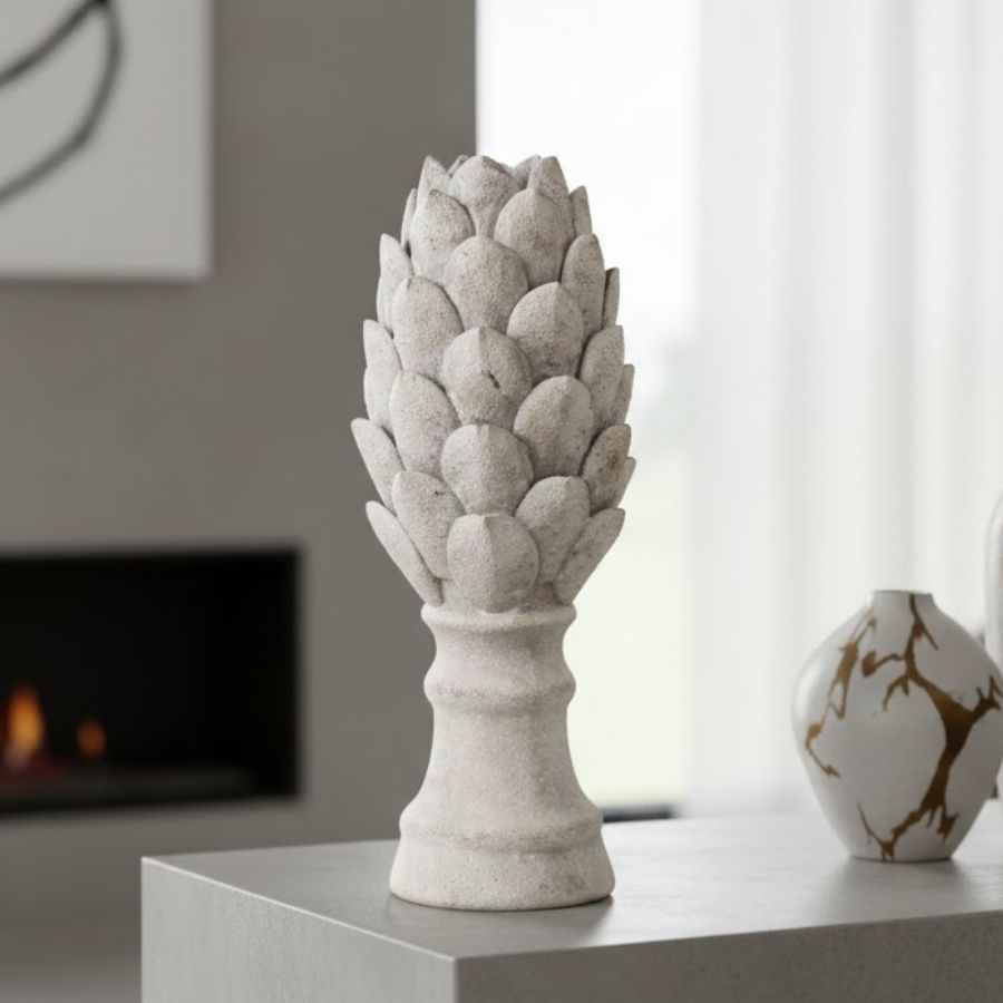 Com dimensões de 26,5x11,5x11,5 cm, a pinha possui tamanho ideal para uso em mesas de centro, aparadores, prateleiras ou nichos. O formato de pinha cria um visual harmonioso e equilibrado, funcionando tanto como peça única quanto em composição com outros objetos decorativos, trazendo personalidade e aconchego ao espaço.