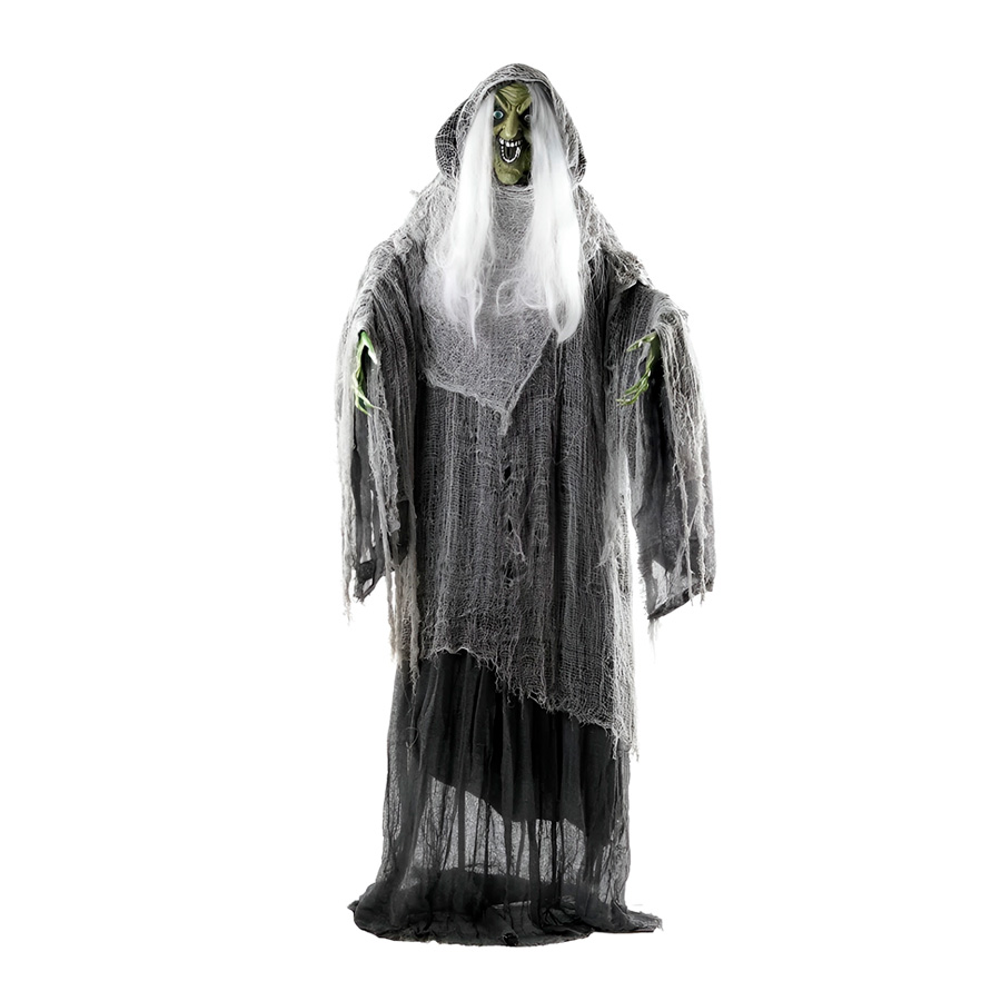 Bruxa decorativa de Halloween cor verde, cabelo branco, possui vestimenta feita de panos velhos cor cinza e preto. Contém sons assustadores e luzes verdes nos olhos.